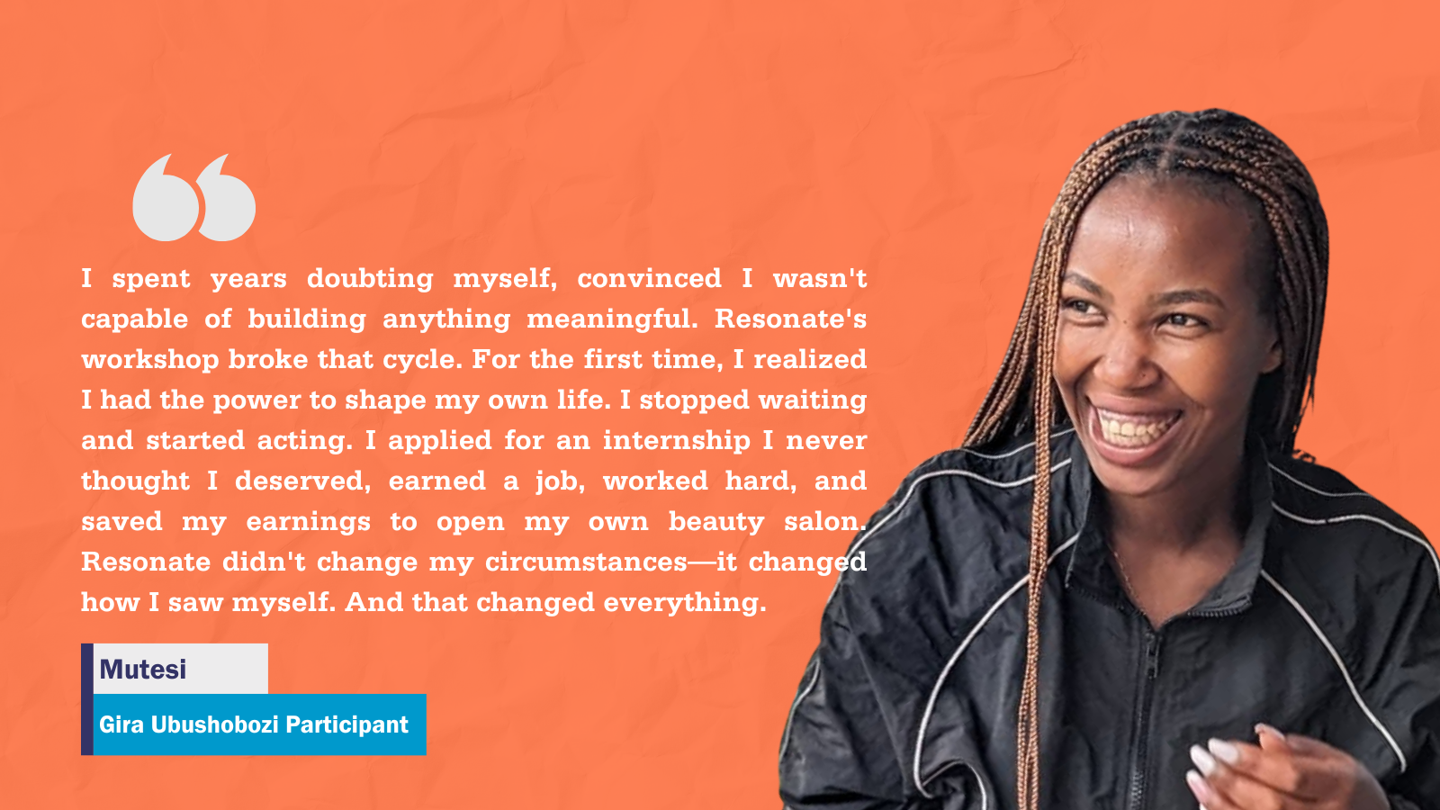 Everything changed after attending Resonate’s workshop. She was inspired during the goal-setting session to create a plan for her future and commit to becoming self-reliant. Mutesi began to believe in herself. She applied for an internship she never would have considered before, secured it, excelled, and was offered a job. With focus and determination, she saved her earnings and went on to open her own beauty salon.